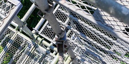 単管足場とは、鉄パイプを金具でつなぎ合わせて組立てる足場のこと。